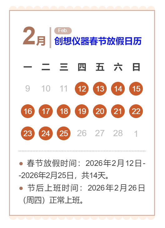 ●?春節放假時間:2026年2月12日--2026年2月25日,共14天。